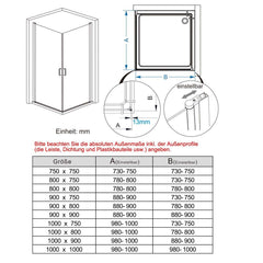 - • Achtung: Bitte messen Sie nach, ob diese Duschabtrennung in den vorgesehenen Raum passt