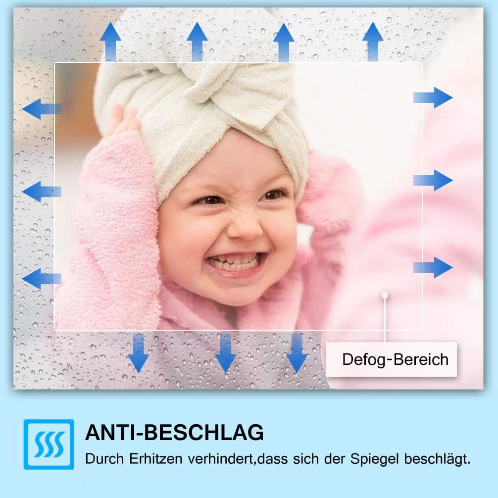 - 【Antibeschlag-Funktion】 Unser Badezimmer LED Spiegel ist mit einer integrierten Heizmatte zum Nebelentfernung ausgestattet. Sobald der Heizschalter eingeschaltet wird, verhindert die Heizplatte, dass der Spiegel beschlägt. So haben Sie auch nach einer heißen Dusche einen klaren Blick.